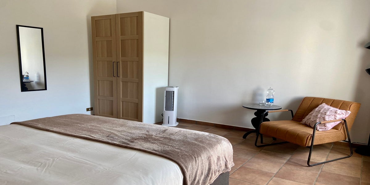 De familiekamer bestaat uit 1 kamer met een 2-persoonsbed, 1 kamer met twee 1-persoonsbedden en een badkamer.